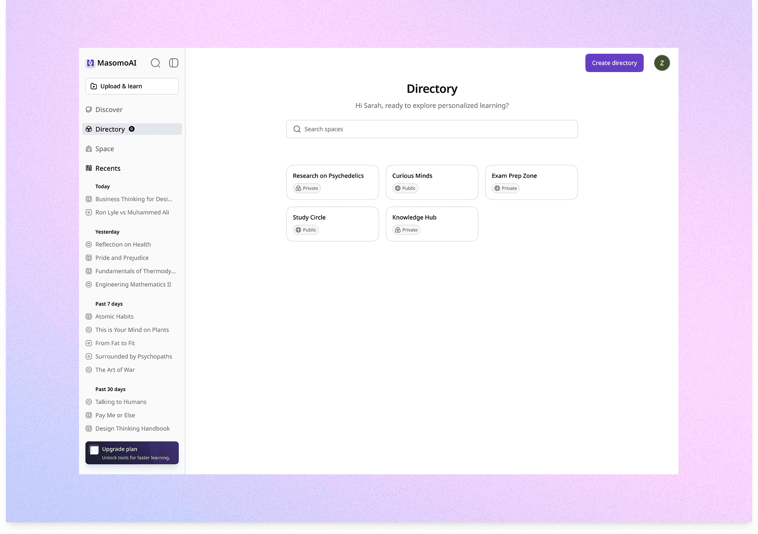 In summary, a Directory is a structured learning course you create by uploading a resource (like a PDF, article, or video) or writing a prompt. Masomo then transforms that material into an interactive learning experience — generating flashcards, summaries, quizzes, and AI chat explanations tailored to the content.